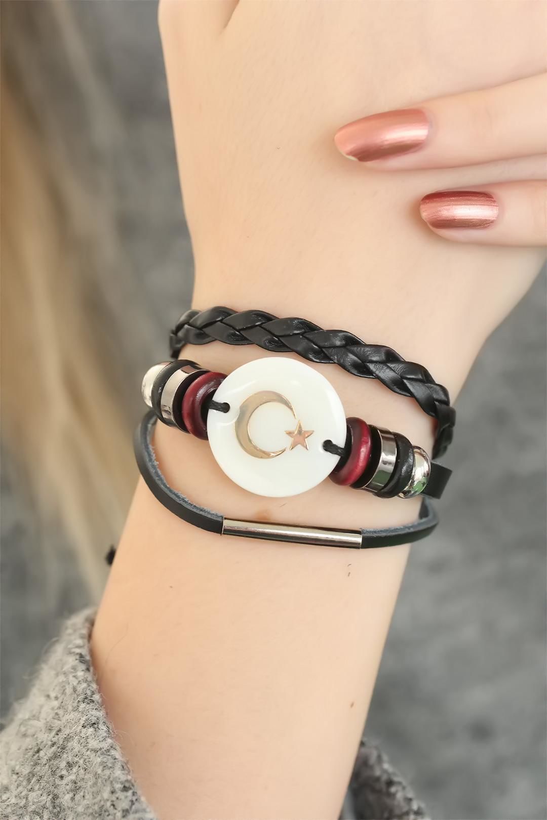 Şıklığa Siyah Renk Ay Yıldız Tasarım Çoklu Deri Bayan Bileklik ile bir adım daha yakın olacaksınız.