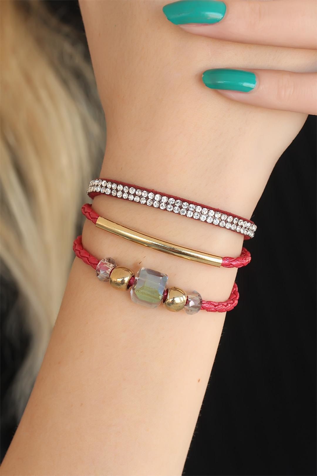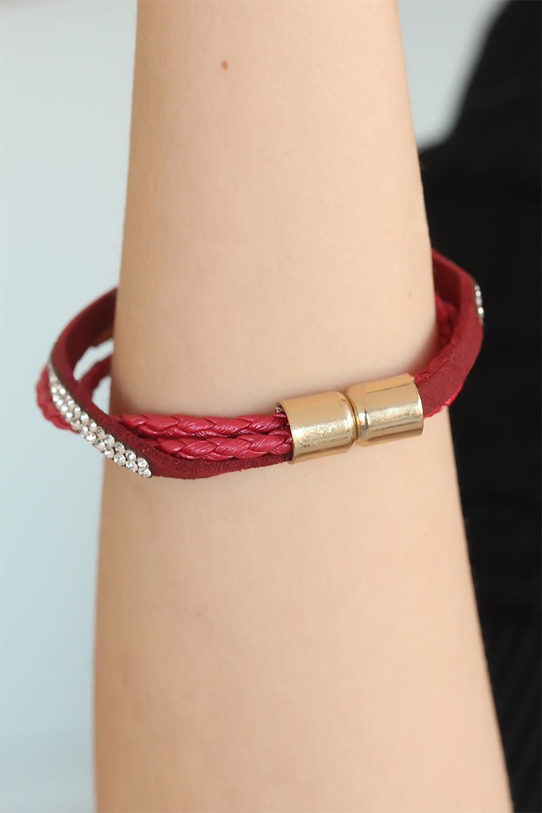 Yeni sezona Taşlı Kırmızı Deri Bayan Bileklik ile damga vurun.